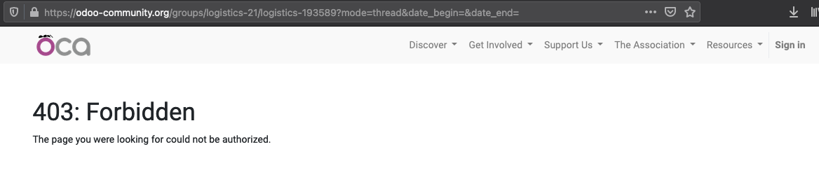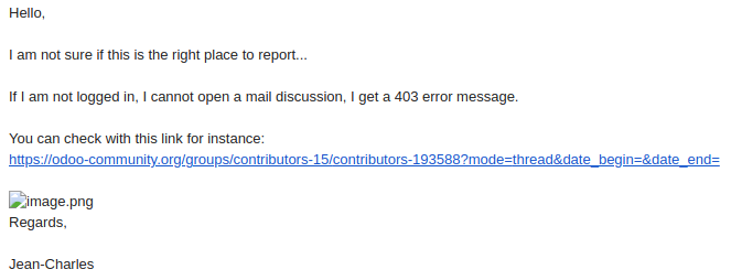 I am seeing 403: Forbidden error message even if logged in:On a side note, I can't see the image in above email:On Thu, 15 Apr 2021 at 12:02, Jean-Charles Drubay <jc@komit-consulting.com> wrote:Hello,I am not sure if this is the right place to report...