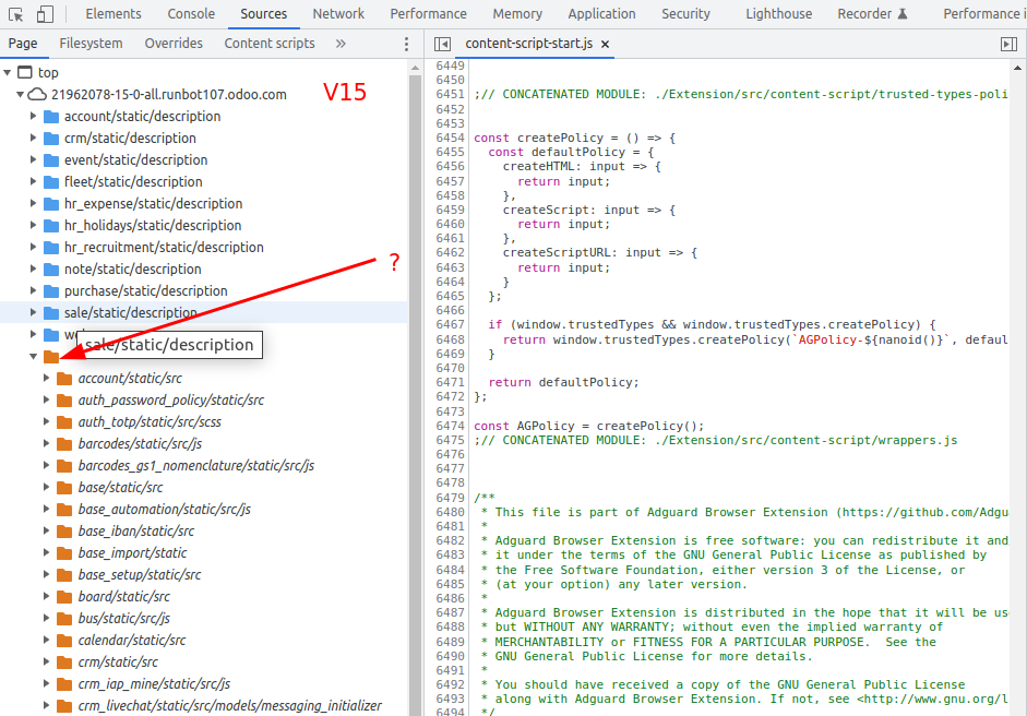 > when debuggin js with chrome in v16 and v15 the js/css is located in a non > named subfolder. In v14, it is not the case. There it looks more right. > (See attached images.) I could believe, thats why I can not debug inside > Intellij, because the path mapping does not work correctly. > > Has anyone here an idea ? the files in the source map those versions generate have leading slashes. Given this is a non-standard by google, I'd figure whatever chrome does is correct and the fact that firefox handles this more gracefully is a fluke. You might try to remove leading slashes in https://github.com/odoo/odoo/blob/16.0/odoo/tools/sourcemap_generator.py#L95 and see if this fixes your problem. -- Your partner for the hard Odoo problems https://hunki-enterprises.com