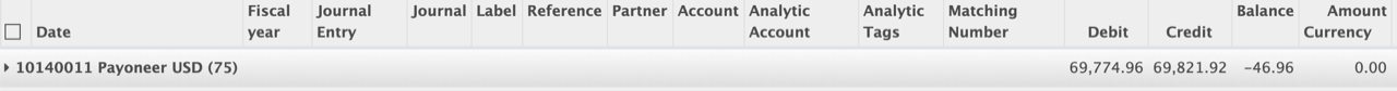 And it’s me again:E.g. I have bank account (thus, + journal, +account in Odoo) in USD. It shows asAnd this -46.96 appears in the MIS report. I’m trying to figure out why or how, but struggling with that :(Kind regards,AlexeyOn 9 Dec 2020, at 15:24, Alexey Pelykh <alexey.pelykh@gmail.com> wrote:Hi Stéphane,Indeed! Thanks, I totally missed that part and assumed for some reason it’s the other way roundKind regards,AlexeyOn 9 Dec 2020, at 15:17, Stéphane Bidoul <stephane.bidoul@acsone.eu> wrote:Hi Aleksey,IIRC it is what it does ? https://github.com/OCA/mis-builder/blob/01e7463cbeb9cbd90effcf271a274632b40c989f/mis_builder/models/aep.py#L329-sbiOn Wed, Dec 9, 2020 at 1:07 PM Alexey Pelykh <alexey.pelykh@gmail.com> wrote:Dear community, Is there a way to get MIS Builder to convert currency using rate at the end of the report period? E.g. “bale” on some account to convert using end of fiscal year conversion rate? Kind regards, Alexey