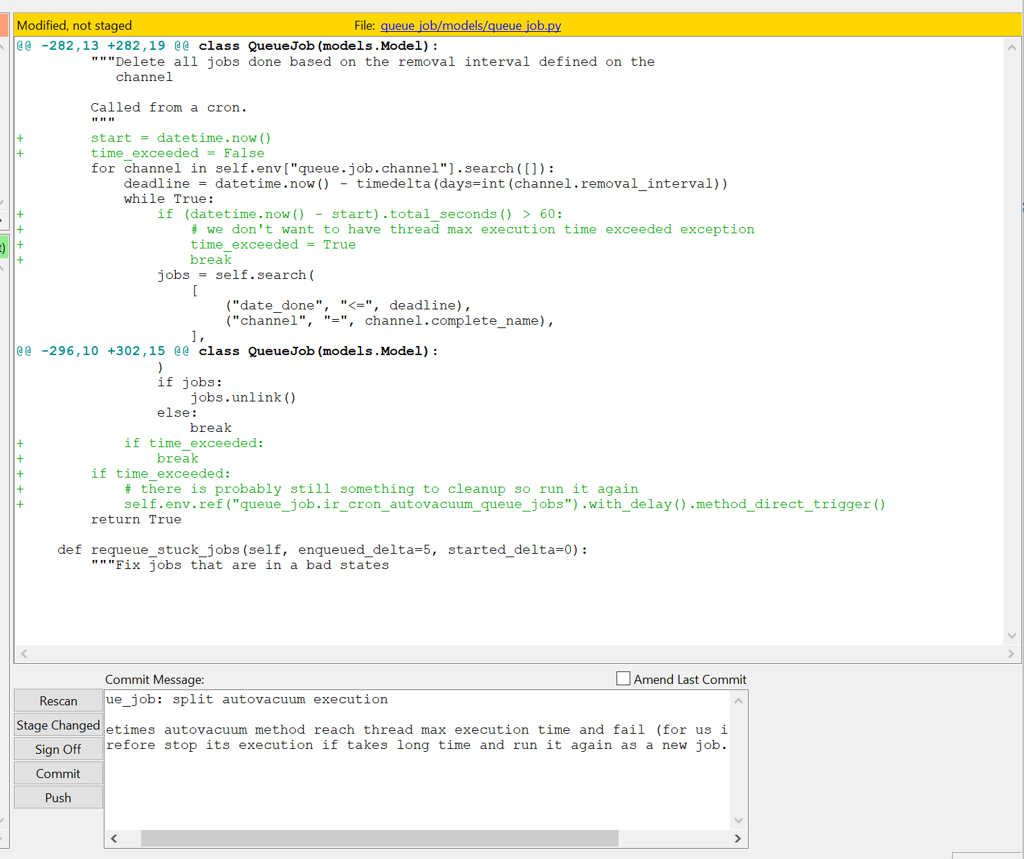 Hi,There is already a pending PR there : https://github.com/OCA/queue/pull/417You can maybe review it ?ThanksOn Thu, Jun 9, 2022 at 10:07 AM Martin Fraňo <waky007@gmail.com> wrote:Hello,I would like to commit fix for queue_job but am not able to do that with git. Is it enough if I send it to you in email so I don't break something in the repo itself? The description and code itself is below.Thanks!queue_job: split autovacuum execution
